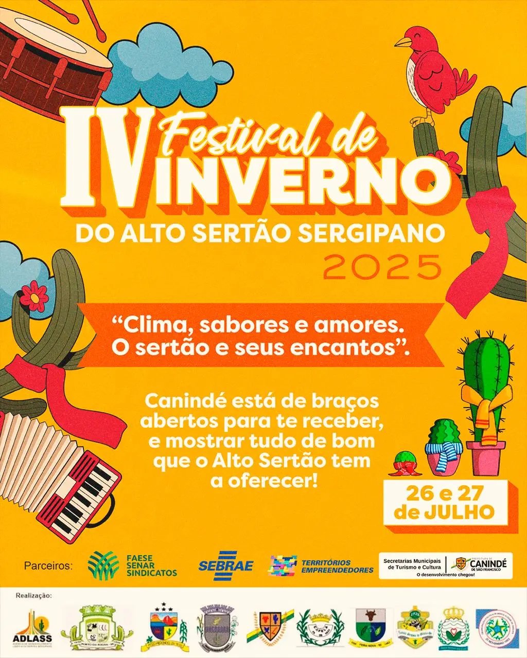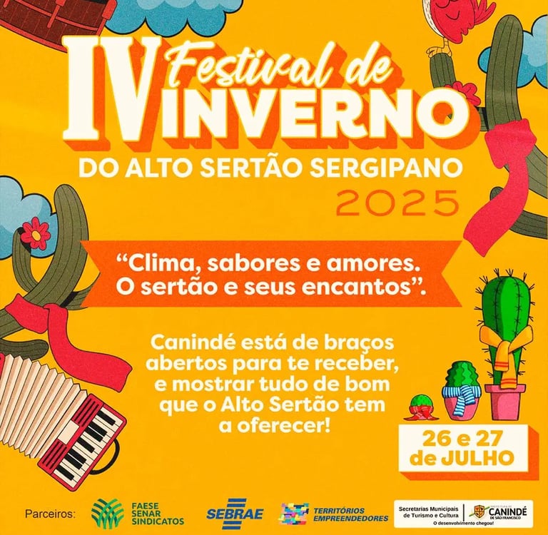 Canindé de S. Francisco - A cidade de Canindé de São Francisco será, mais uma vez, o cenário de um dos maiores eventos culturais do interior de Sergipe: o IV Festival de Inverno do Alto Sertão Sergipano (FIASS). O evento será realizado nos dias 26 e 27 de julho de 2025, às margens do rio São Francisco, reunindo arte, tradição e a força da cultura sertaneja.
