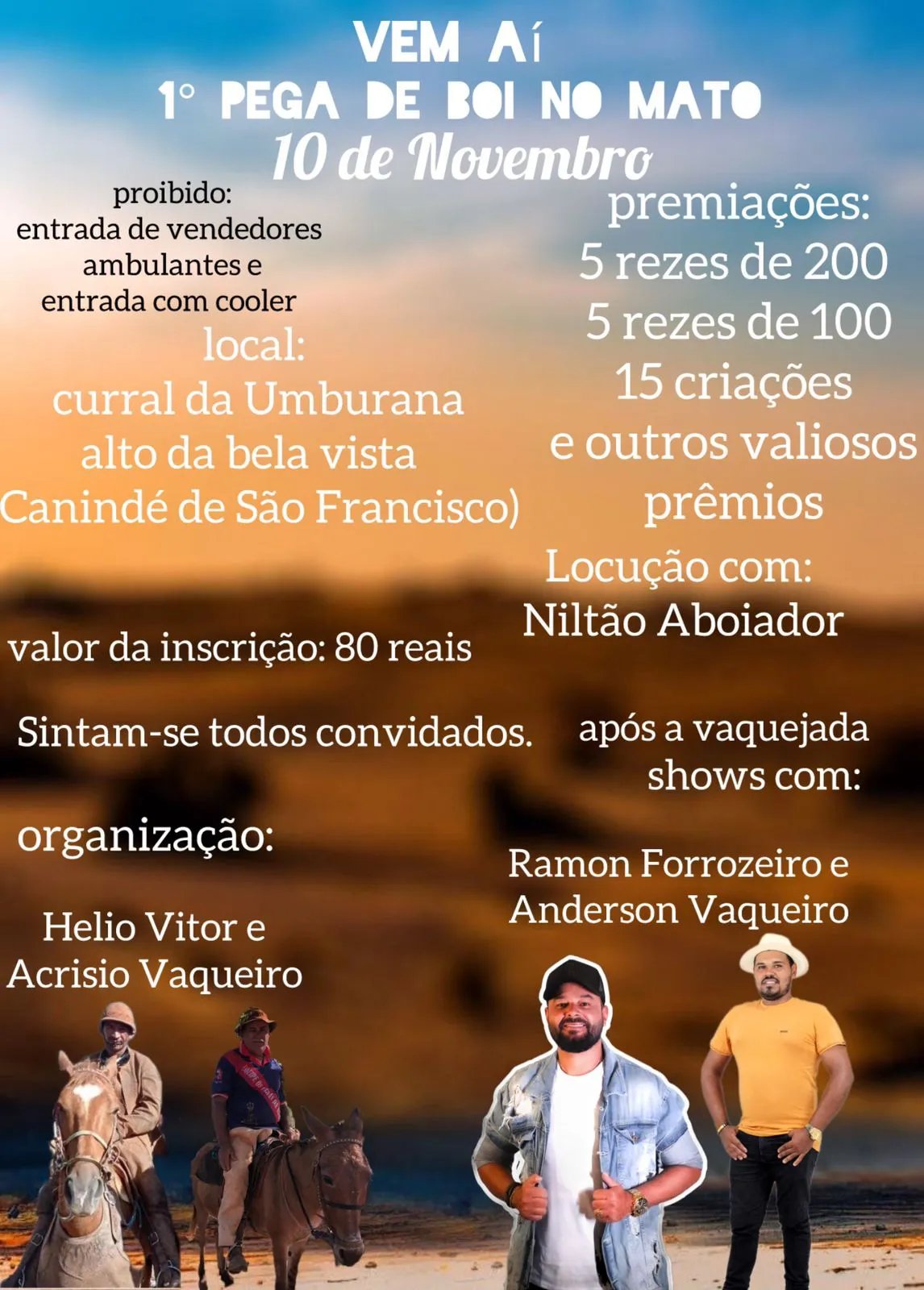 A locução do evento fica por conta de Niltão Aboiador, figura conhecida na região, que garantirá uma trilha sonora com aboios tradicionais. Além disso, a festa terá shows com Ramon Forrozeiro e Anderson Vaqueiro, trazendo o melhor do forró e música sertaneja. O evento é organizado por Hélio Vitor e Acrísio Vaqueiro, que destacam o compromisso com a preservação da tradição e da segurança dos participantes e animais.