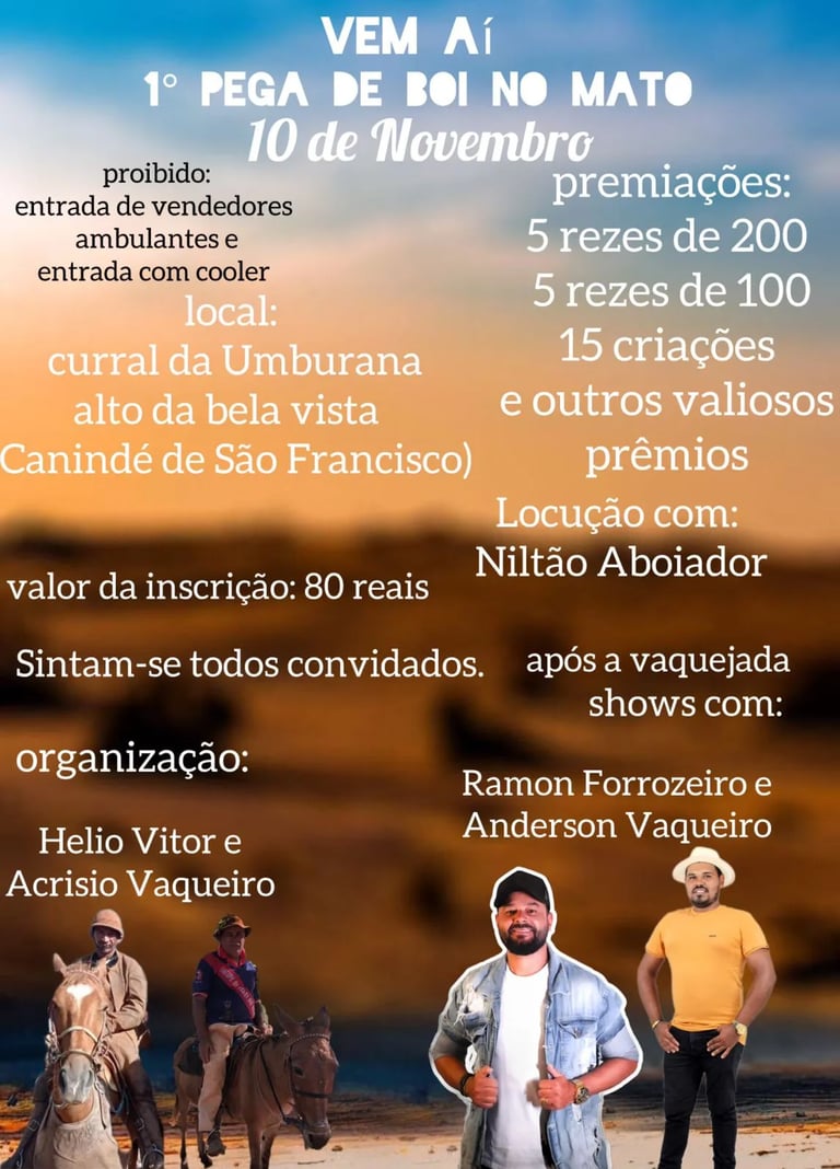 No dia 10 de outubro de 2024, os amantes da tradição sertaneja terão um grande encontro no Curral da Umburana, no Alto da Bela Vista, em Canindé de São Francisco. É lá que acontecerá a Primeira Pega de Boi no Mato, evento que promete resgatar uma das práticas mais autênticas da caatinga: a pega de boi. Nesse desafio, o vaqueiro, com sua habilidade e coragem, persegue e derruba o gado, mostrando a essência de uma cultura que atravessa gerações no sertão.